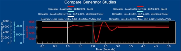 - Simulate load shedding, isolation from utility, transfer switching, loss of excitation, blocked governor, block load changes, motor starting, and fault conditions.